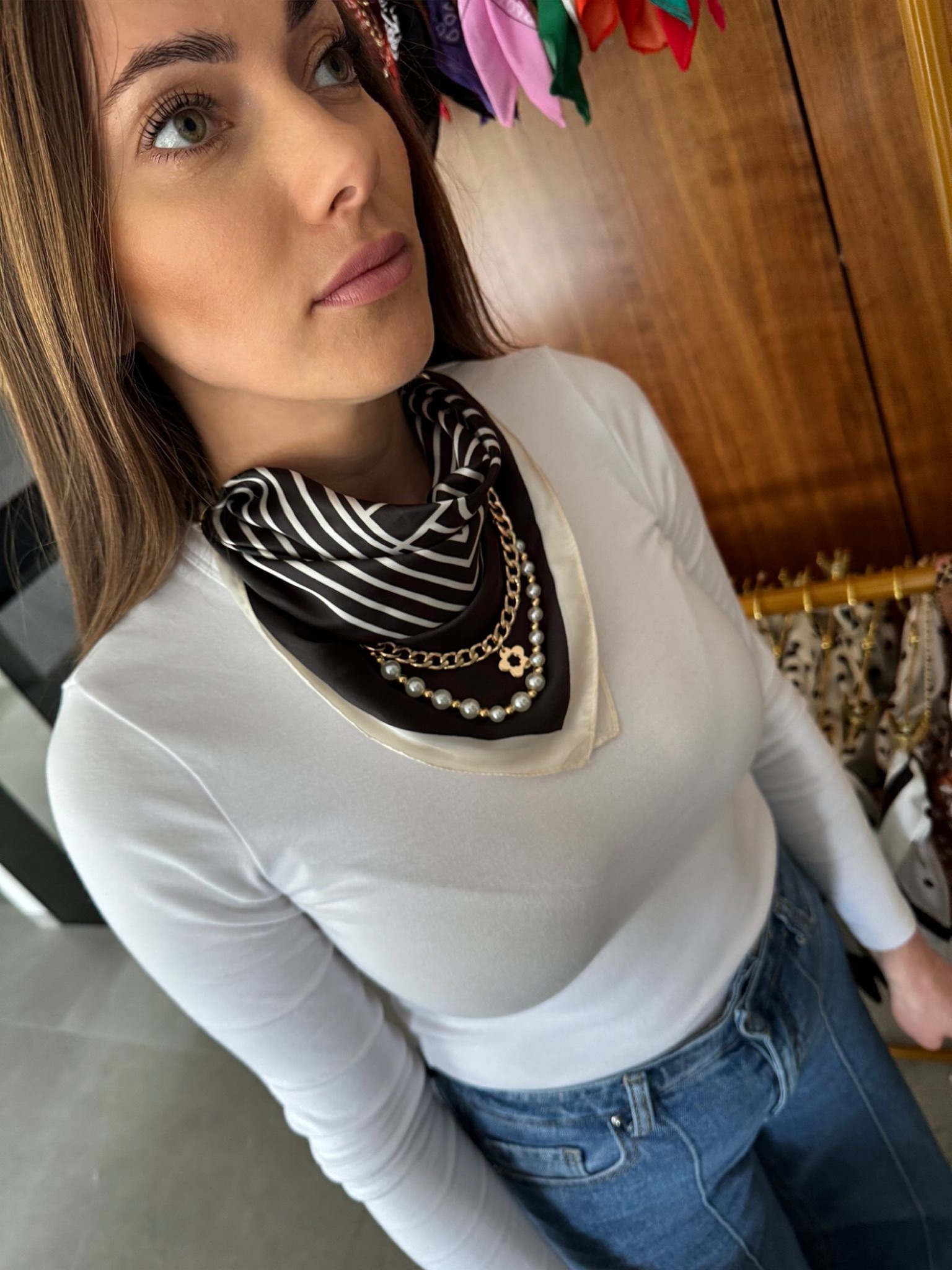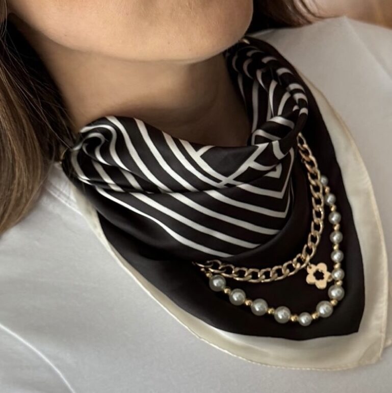 Możesz nosić ją klasycznie na szyi, jako stylowy akcent do koszuli, marynarki czy prostego topu, a także jako dodatek do torebki lub włosów. Doskonale komponuje się z bielą, czernią, denimem i złotą biżuterią.