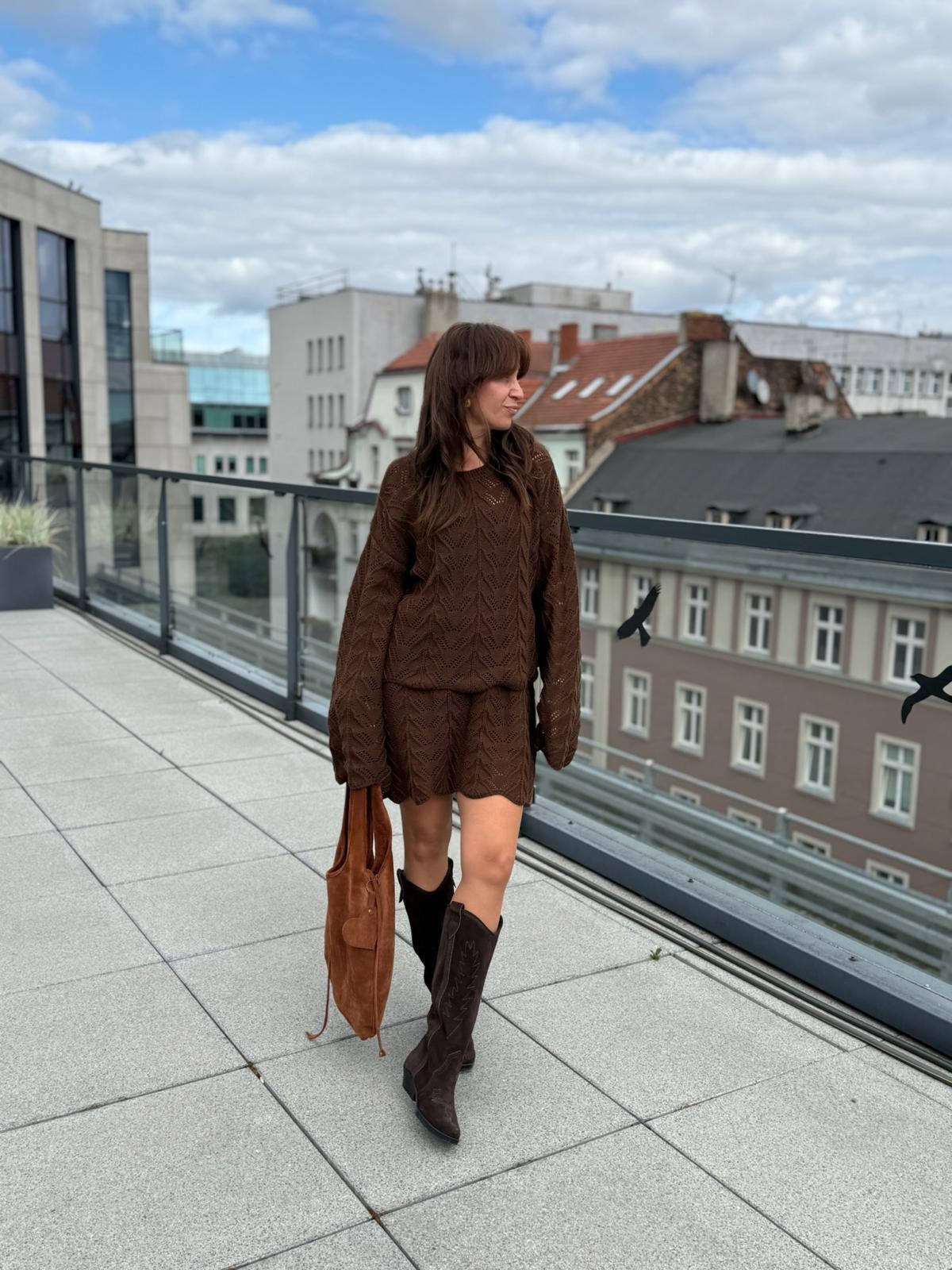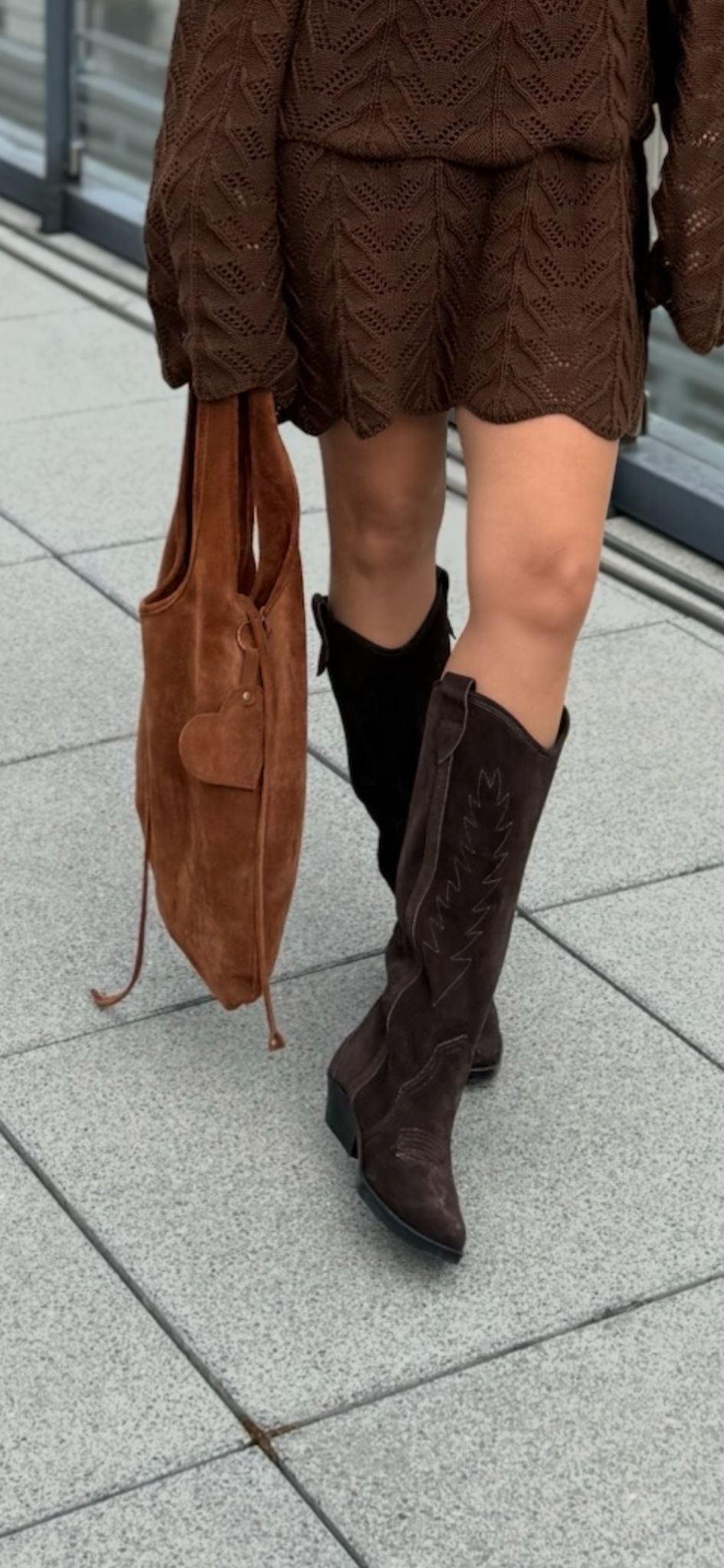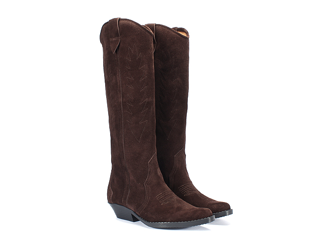 Wysokie kowbojki wykonane z naturalnej skóry welurowej w głębokim czekoladowym kolorze.