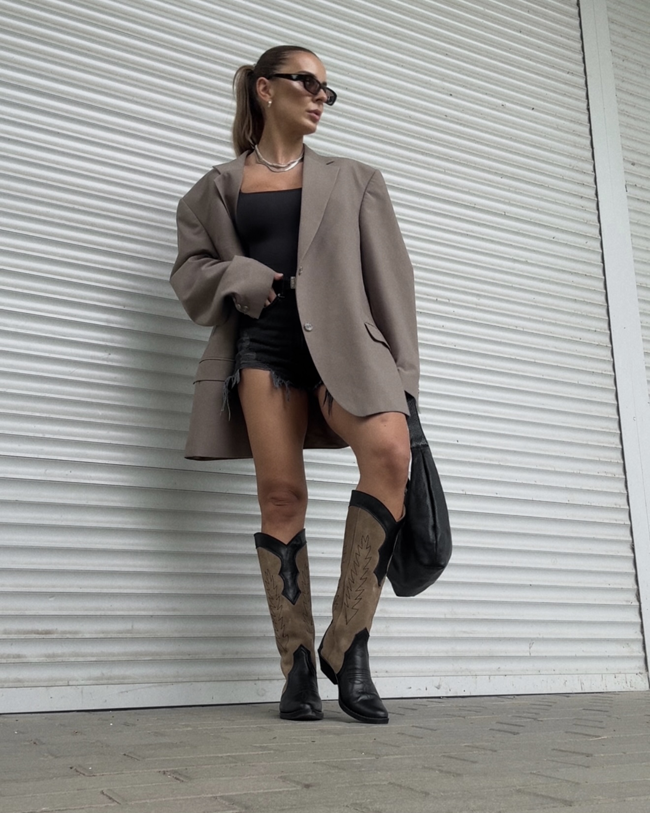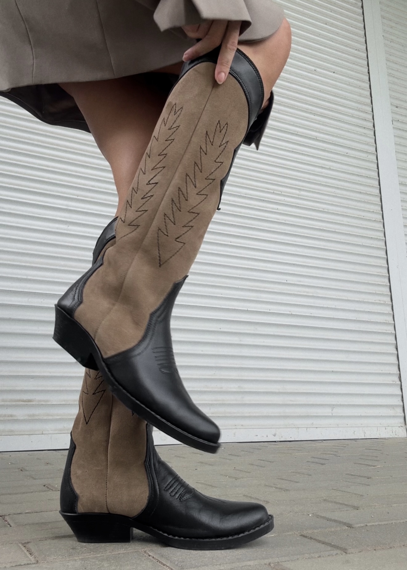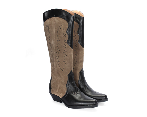 Kozaki do kolan w stylu kowbojskim wykonane z miękkiej skóry licowej i welurowej, podszyte podszewką.